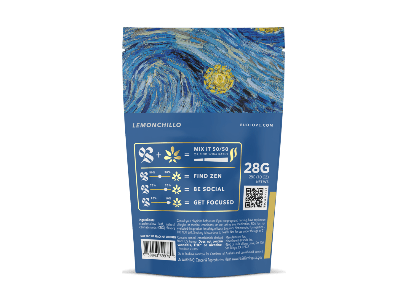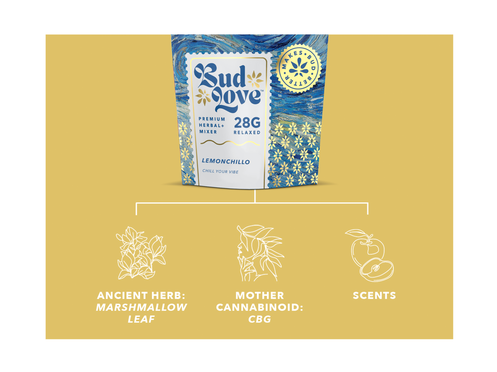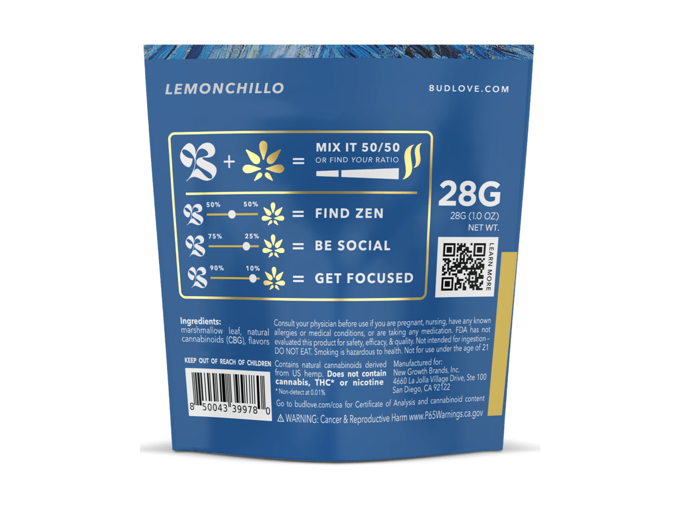 Ingredients: marshmallow leaf, CBG (10%), flavors. Contains natural cannabinoids derived from US hemp. Does not contain cannabis, THC* or nicotine. Go to budlove.com/coa for Certificate of Analysis.