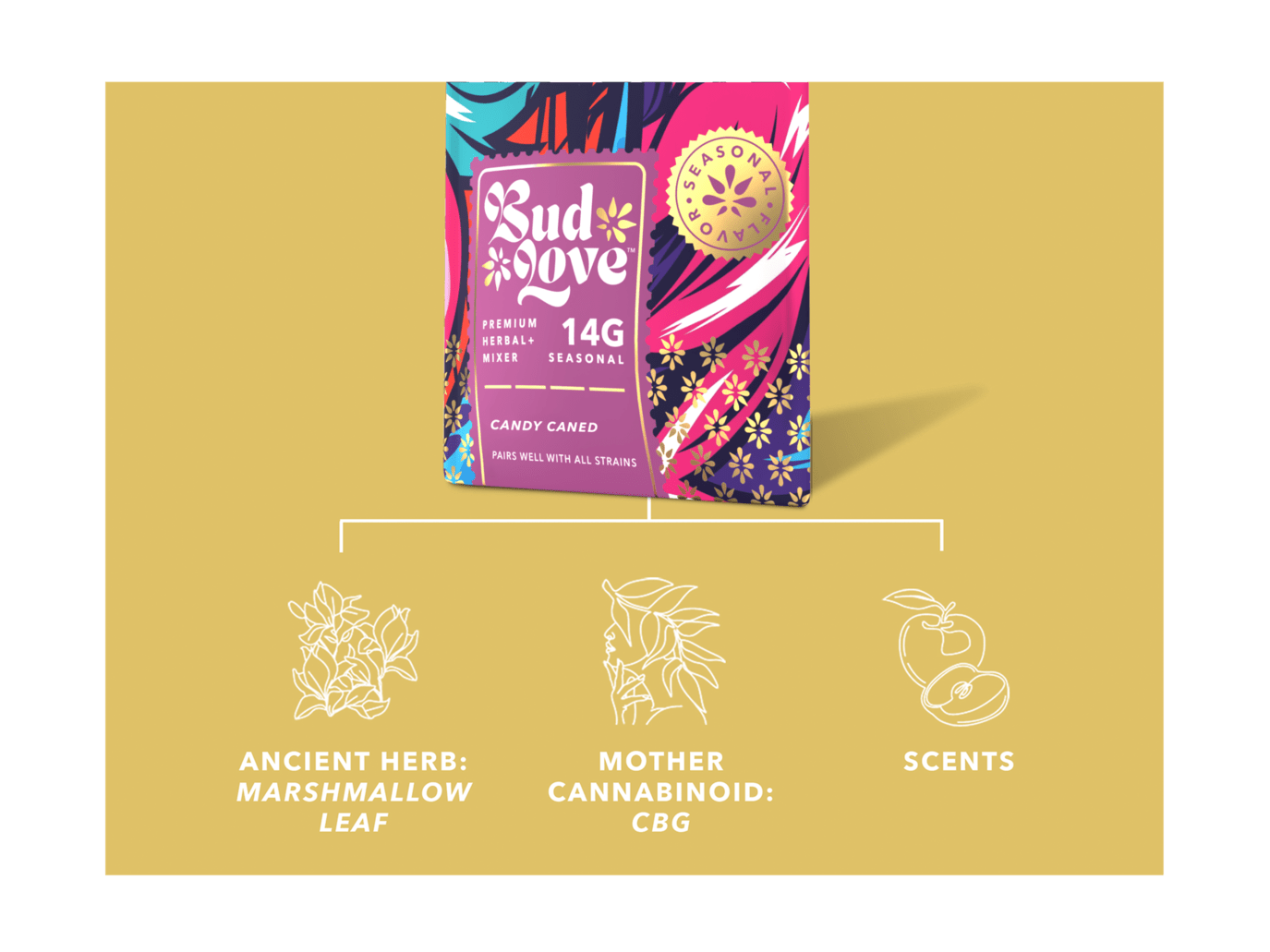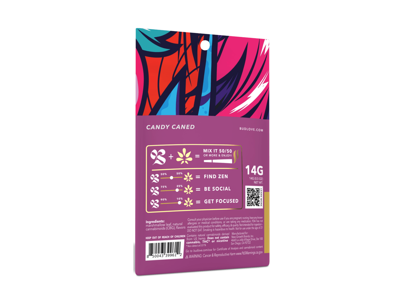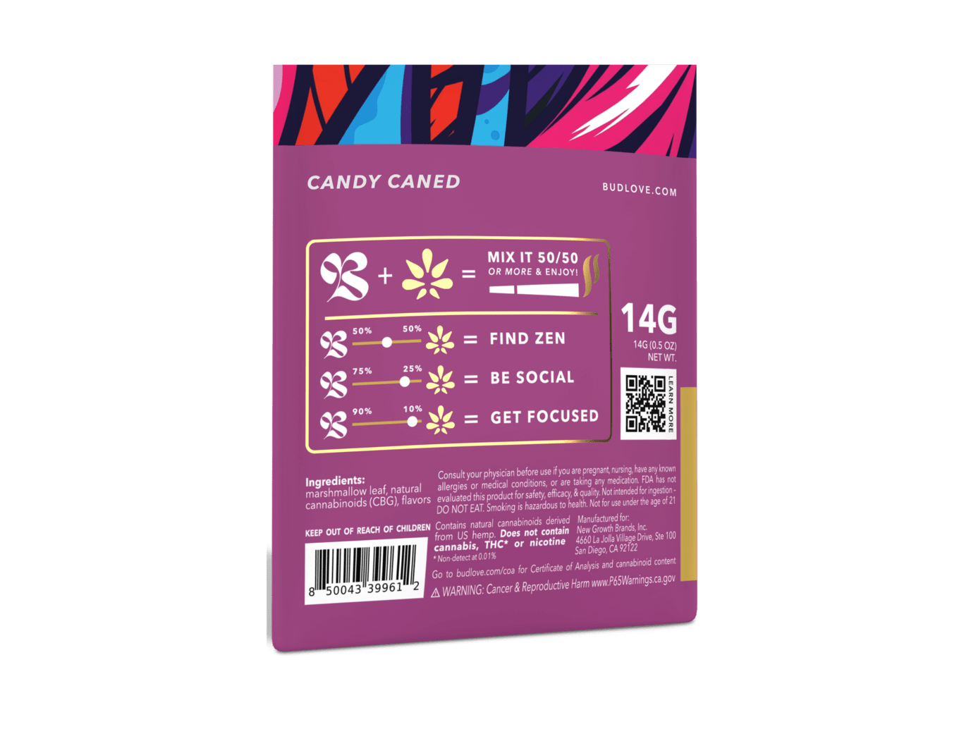 Ingredients: marshmallow leaf, CBG (10%), flavors. Contains natural cannabinoids derived from US hemp. Does not contain cannabis, THC* or nicotine. Go to budlove.com/coa for Certificate of Analysis.